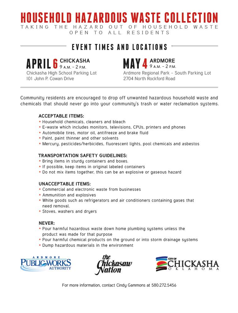 [OKRA] Household Hazardous Waste Collections in Chickasha (April 6th) and Ardmore (May 4th)