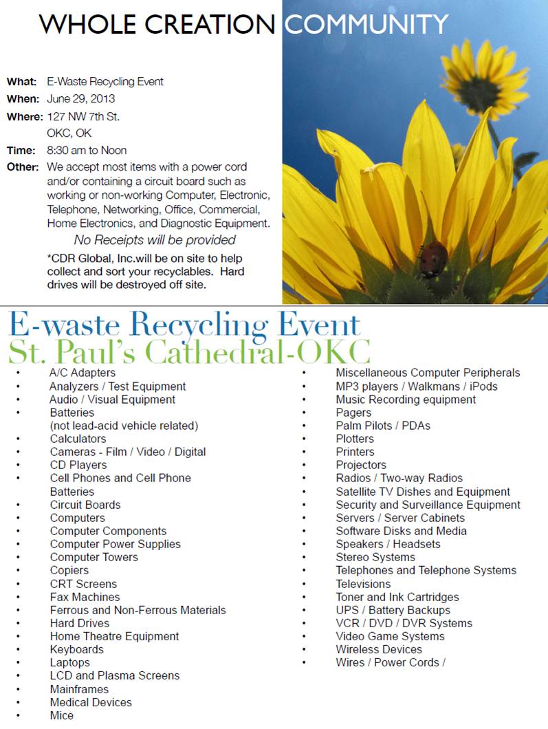 An E-waste event is planned for Saturday, June 29th from 8:30 am to noon in the St. Paul's Cathedral Parking lot on 7th and Robinson in Oklahoma City.