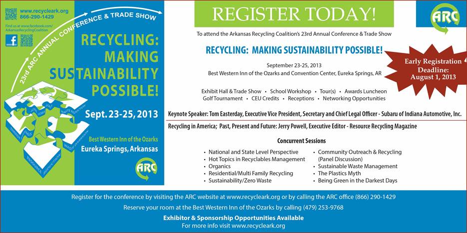 Please see info below regarding the Arkansas Recycling Coalition's Annual Conference & Trade Show. For more info, contact Cherie O'Mary, 866-290-1429, www.recycleark.org<http://www.recycleark.org>