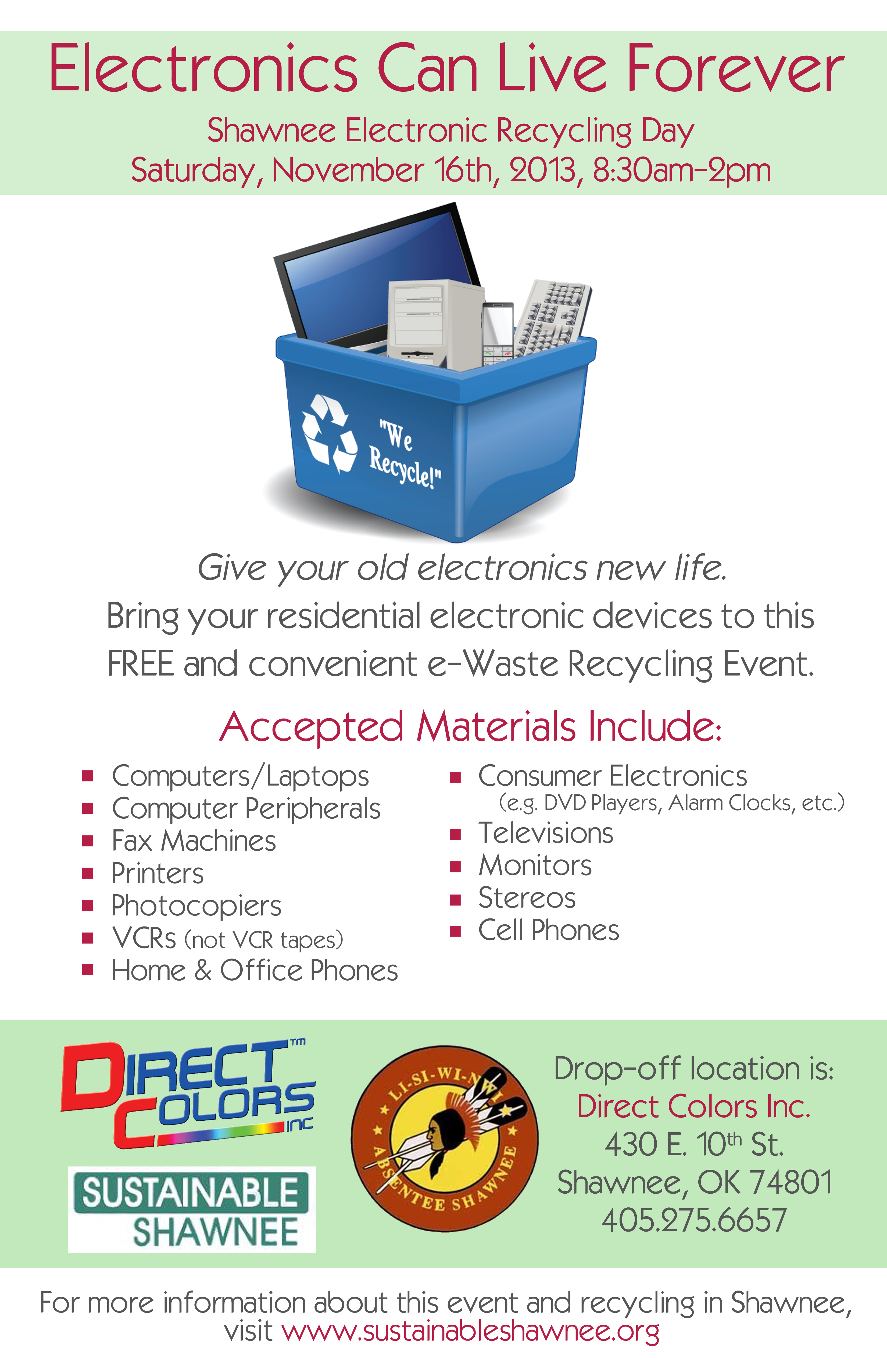 Free E-Waste collection in Shawnee, Saturday, Nov. 16, 8:30am - 2:00pm. Open to all Oklahoma residents!