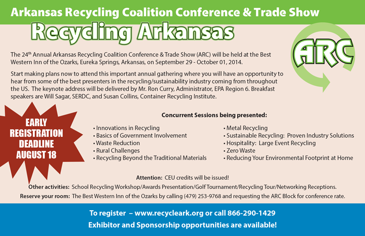 lowest prices! Visit the ARC website (www.recycleark.org) to learn more about the Keynote, Sessions, Tour, Workshop, Golf Tournament, Networking Receptions and CEU Credits.