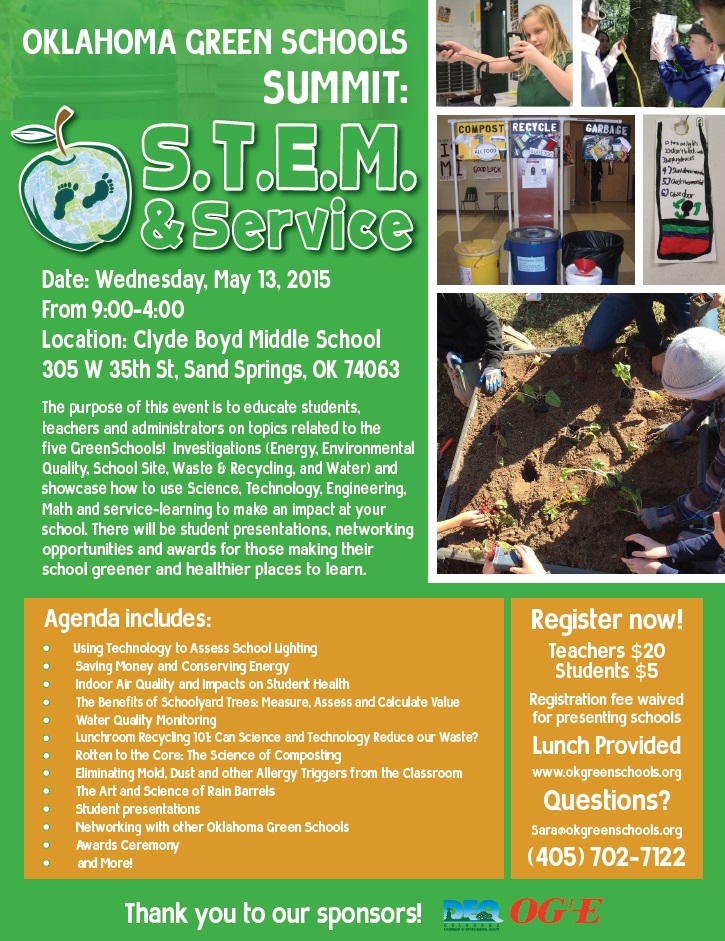 We hope you will join us to learn, share and network with other schools in Oklahoma that are going green! Click Here to Register!<http://www.okgreenschools.org/registration-page/>