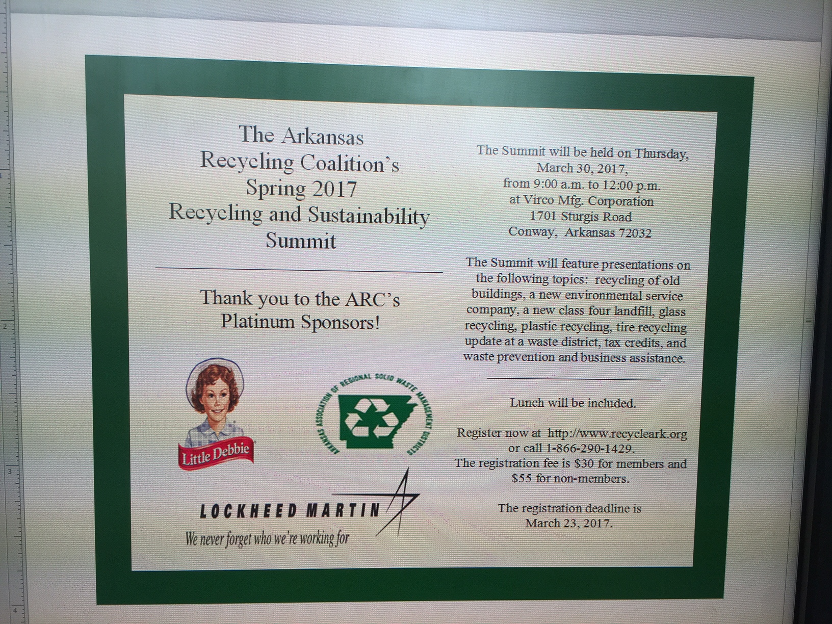 See info below and attached regarding the Arkansas Recycling Coalition’s Spring 2017 Recycling and Sustainability Summit. The registration deadline is March 23!