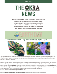 Check out all of the Earth Day events taking place around the state, along with inspiring recycle stories and a special farewell tribute to OKRA Board member Jeanette Nance as she steps down from the OKRA Board and into new roles!